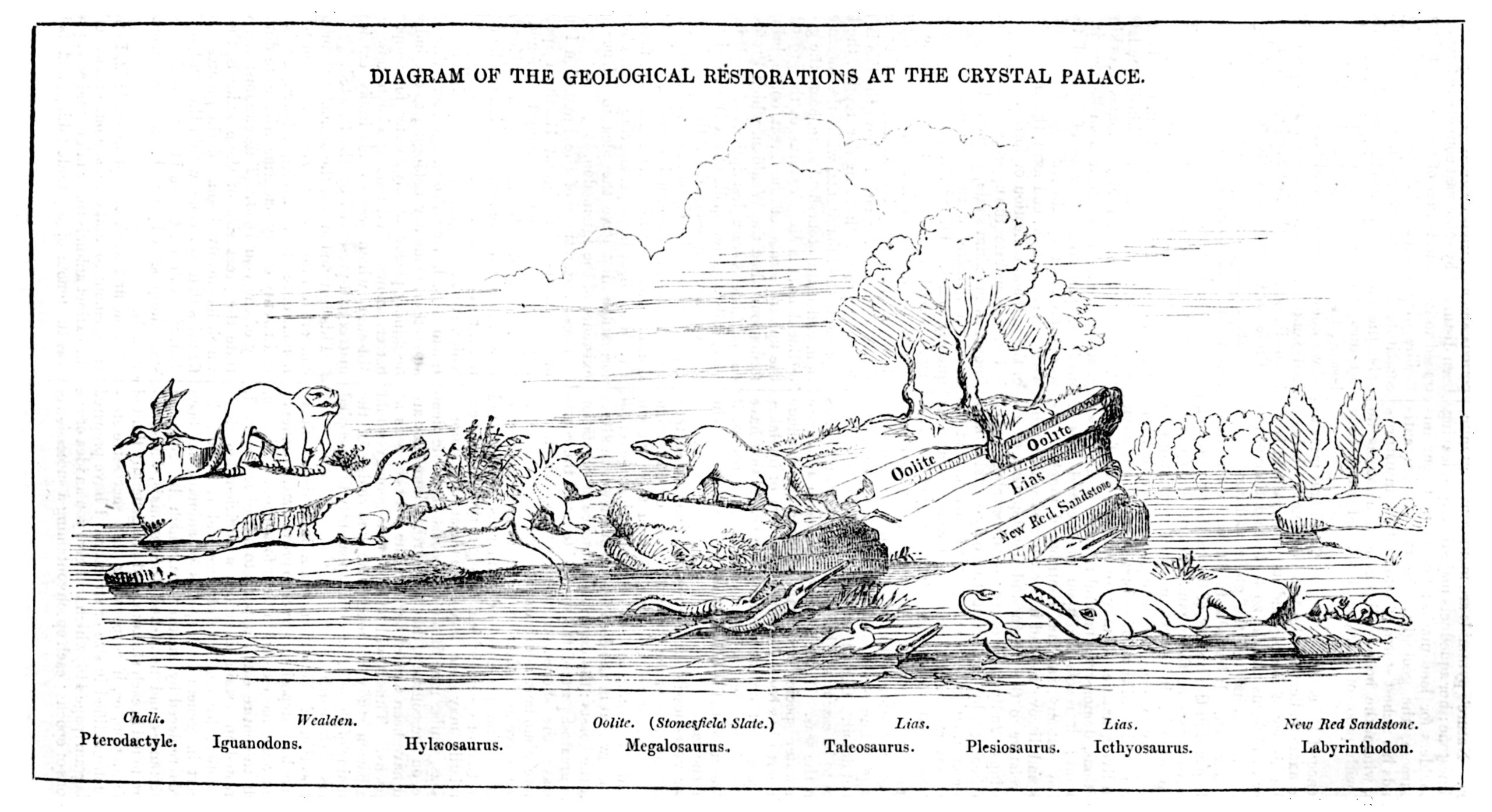 Hawkins discussed his famous statues – and his underlying ambitions for the exhibition as a whole – in an evening lecture at the Royal Society of Arts on Wednesday May 17, 1854. He toured the country with the same material. The Crystal Palace and Park in Sydenham was on the verge of opening (details), and publicity for that event was well underway, including Royal visits by Queen Victoria and Prince Albert.