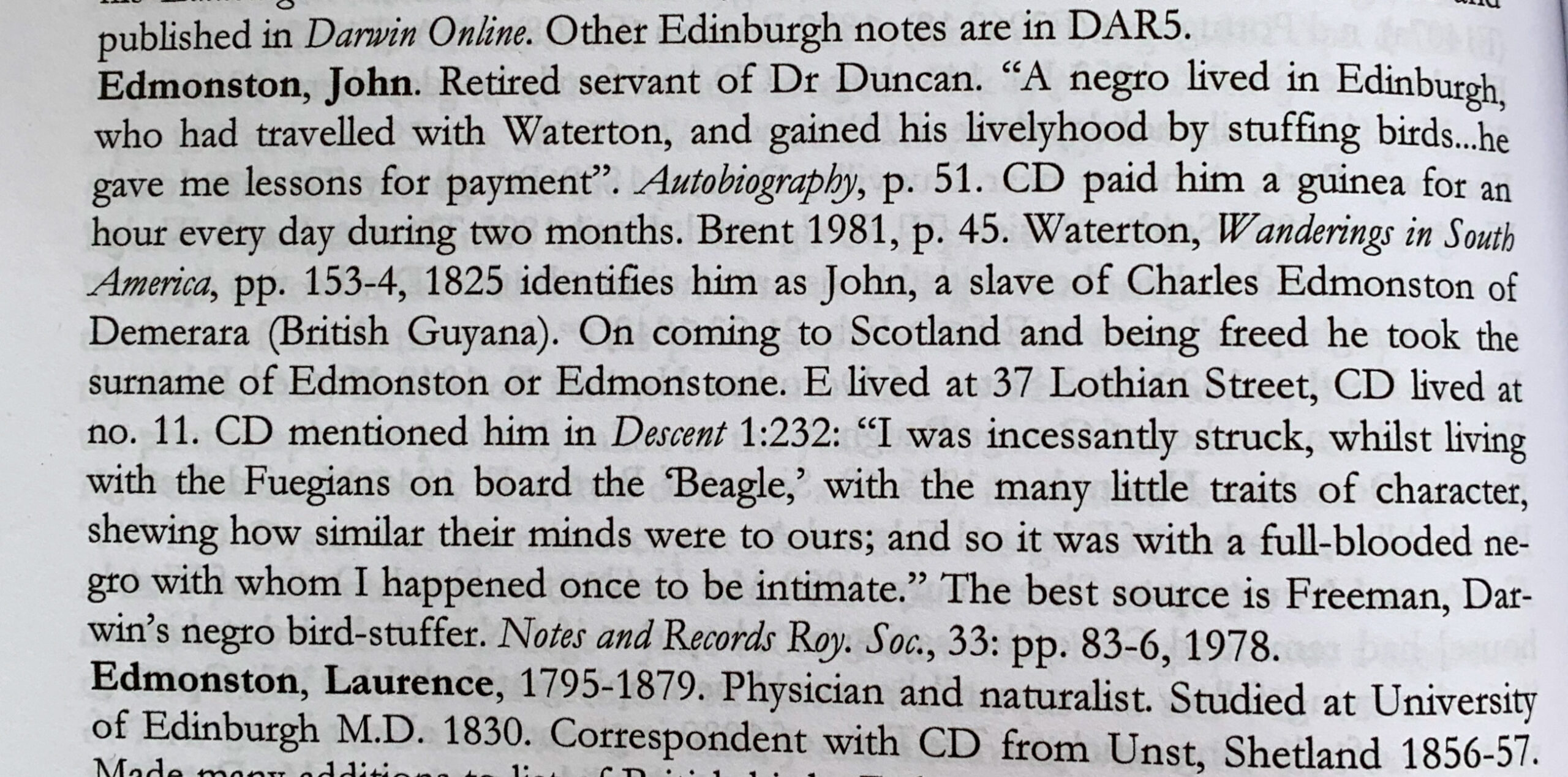 The original detective work on Darwin’s autobiography to identify John was published by RB Freeman in a 1978 communication to the Royal Society, “Darwin’s negro bird-stuffer”. Freeman first identified John Edmonstone as the person noted in Darwin’s Autobiography. Most 21st century descriptions about this connection ultimately derive from Freeman.