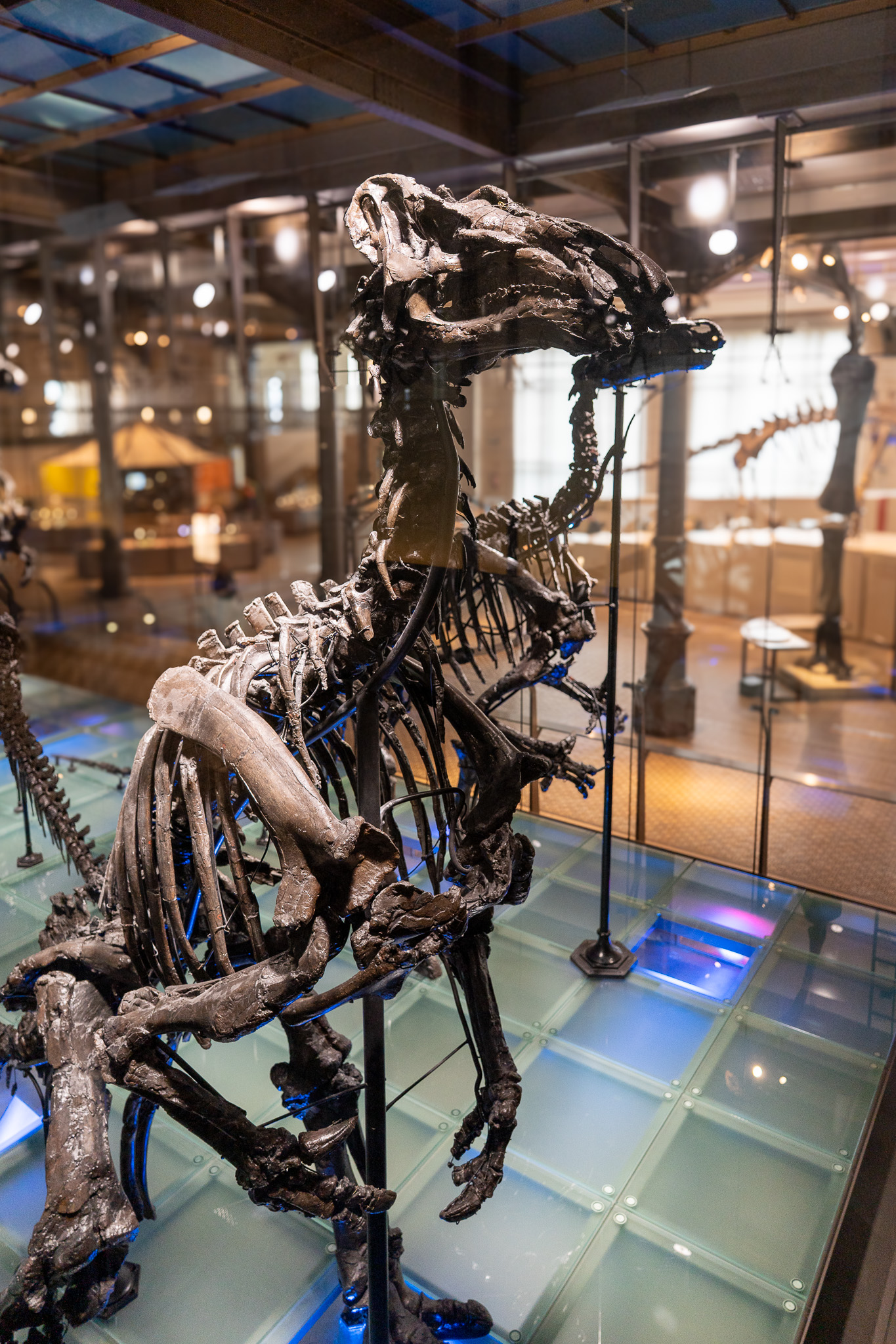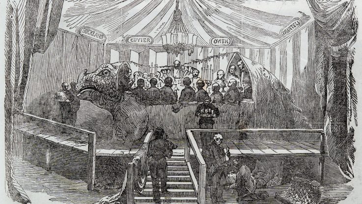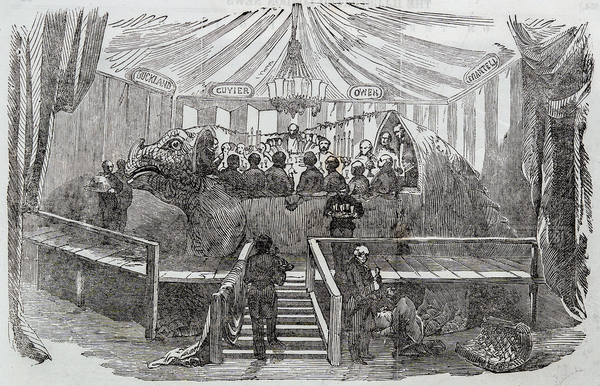 The famous dinner scene depicts a collection of gentlemen sitting around a table inside one of two Iguanodon models under construction during the winter 1853-54. In the scene, waiters deliver dinner and drinks. On the floor is a piece of casting used to create the sculpture. The dinner scene is surrounded by a giant canopy decorated with a chandelier and four plaques honouring famous palaeontologists (William Buckland, Georges Cuvier, Richard Owen, Gideon Mantell). Because the Iguanodon model stood several metres tall, a raised platform was required for staff and guests to reach inside.