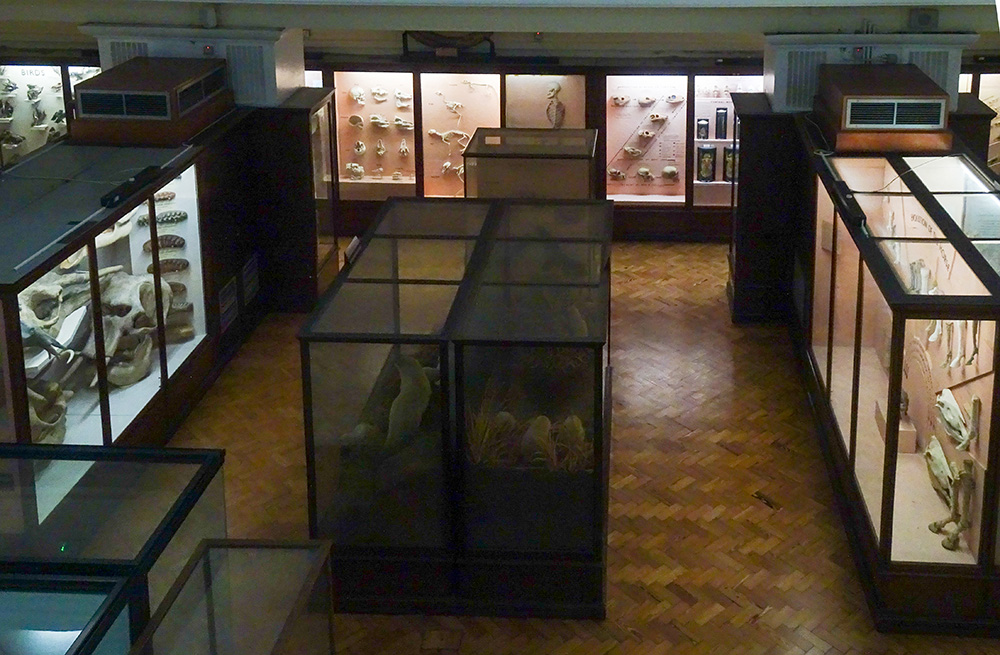 Evidences of Evolution relies heavily on what should be called a modified outline from Charles Darwin’s (1859) Origin of Species. A series of cases along the east wall of the gallery present vertebrate comparative anatomy (structure), then variation of animals under domestication and variation in nature. Nearby cases add illustrations of speciation as seen through classification as well as spectacular illustrations of sexual selection. Phylogeny is illustrated with two examples: horses and elephants.