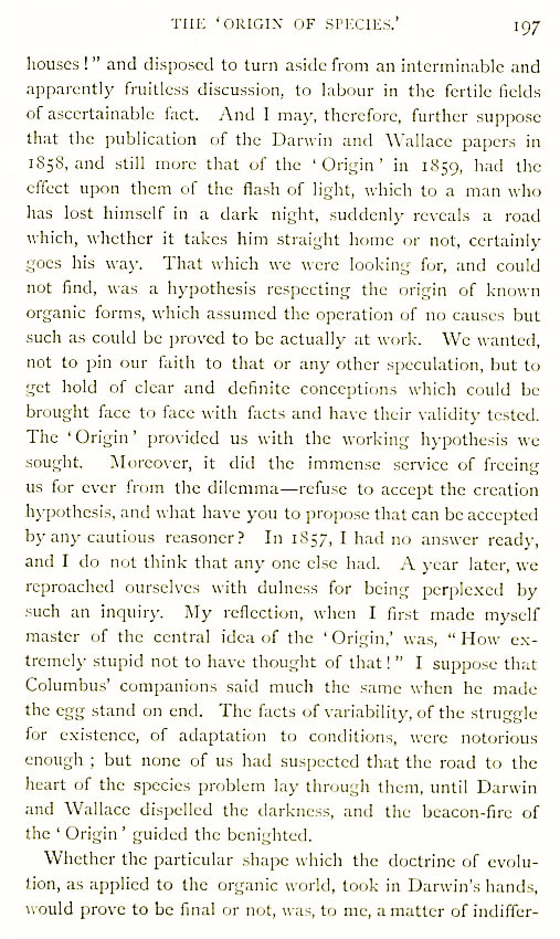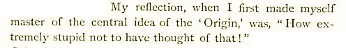 “The ‘Origin’ provided us with the working hypothesis we sought. Moreover, it did the immense service of freeing us for ever from the dilemma – Refuse to accept the creation hypothesis, and what have you to propose that can be accepted by any cautious reasoned? In 1857 I had no answer ready, and I do not think that anyone else had. A year later we reproached ourselves with dullness for being perplexed with such an inquiry. My reflection, when I first made myself master of the central idea of the ‘Origin’ was, ‘How extremely stupid not to have thought of that!’ I suppose that Columbus’ companions said much the same when he made the egg stand on end.” (Huxley 1887: 2:197)