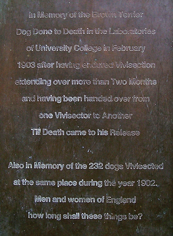 Plaque on Plinth of 1985 Brown Dog Statue (by Nicola Hicks) repeating original libel about University College (UCL)