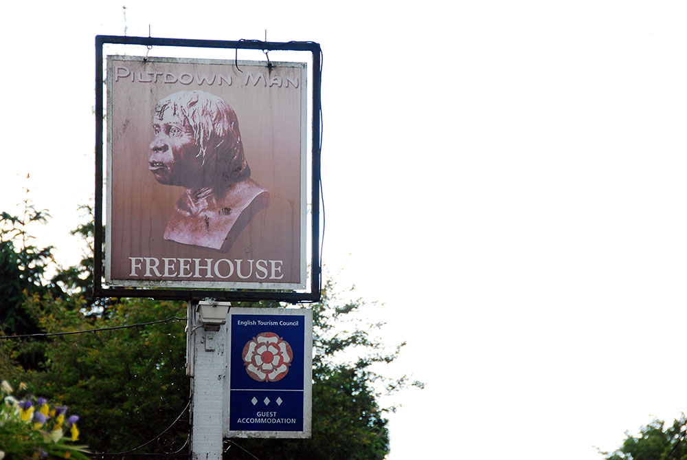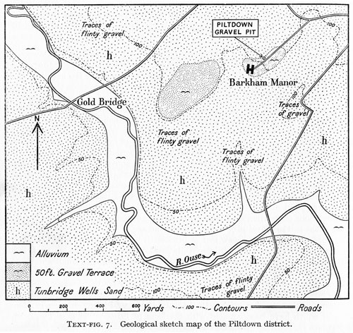 The infamous, fraudulent “Piltdown Man” materials (named Eoanthropus Dawnonis, or the Dawn Man) were planted in a Pleistocene gravel pit on Barkham Manor near the village of Piltdown, East Sussex. This location lies on the rolling downland south of the Ashdown Forest. Though the exact pit is on private land near the modern-day hamlet, a memorial stonemarks the general site of the notorious archaeological fraud. The web is full of commentaries about Piltdown Man and its exposure as a fraud. But where is the original locality?