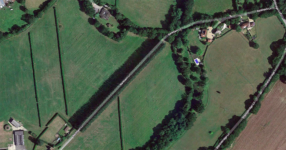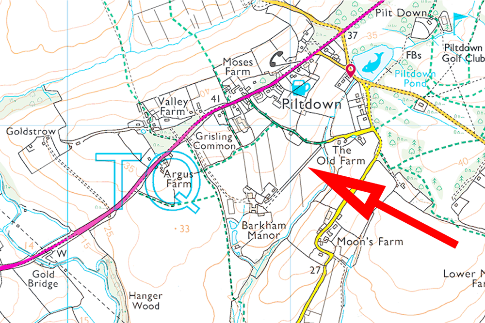 Piltdown, East Sussex, of course. The exact location – the spot on the map – is well known to specialists. The location is “Barkham Lane, Uckfield, TN22 3XE, East Sussex”.